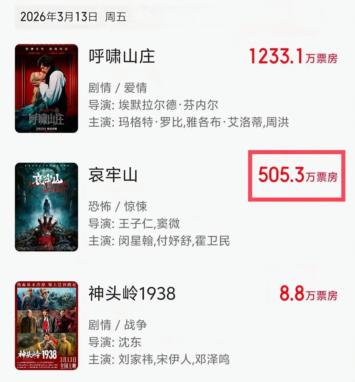 《神头岭1938》彻底扑街了。上映时间都已经过去5天了,才拿下8.8万的票房成绩,怕是把这点钱全分给片方,照样难逃血本无归的下场,毕竟单单两位主演的片酬加在一起都得小一百万起步。